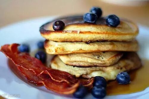 美国人还喜欢做厚煎饼,搭上果汁和蓝莓,另外再放一些培根薄片。