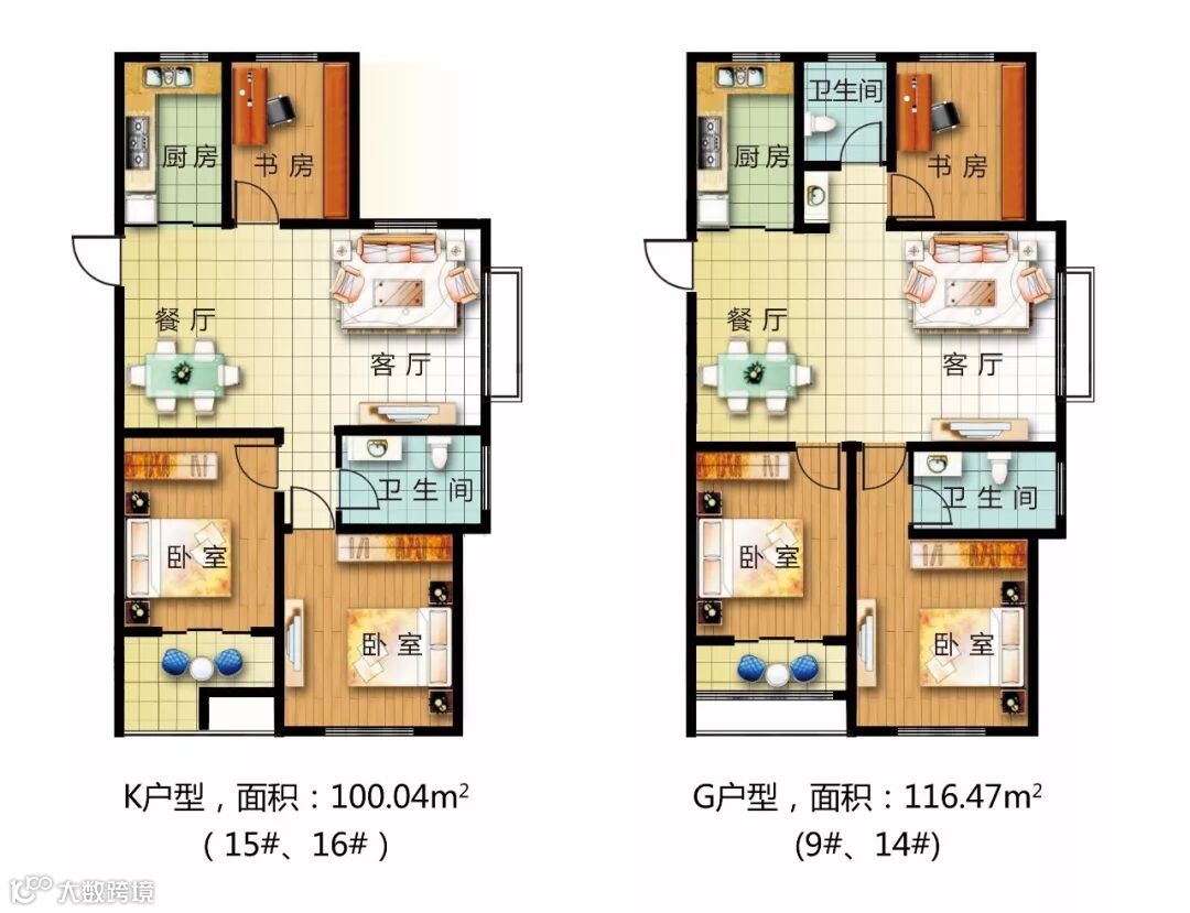 与一期不同,根据现阶段购房朋友对户型的需求,二期增添了100~120㎡段的两款户型。