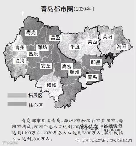 青岛都市圈由青岛、潍坊2市和烟台市莱阳市、海阳市构成。2020年总人口达到2000万人,其中城镇人口达到1400万人;2030年总人口达到2300万人,其中城镇人口达到1800万人。