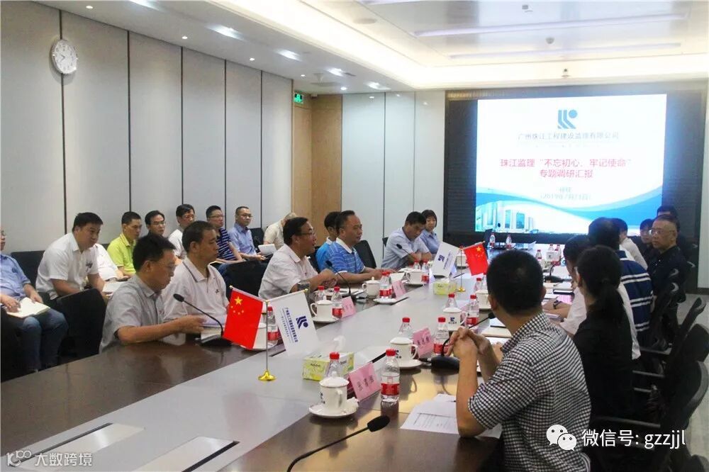 珠江监理领导班子向调研组作“不忘初心、牢记使命”专题调研汇报。廖晓明副总经理在认真听完汇报后,他指出,珠江监理要运用好主题教育成果,抓住行业转型升级战略机遇期,建设好人才队伍,抓好安全生产管理,统一思想、开拓创新,整合资源、积极作为,推动全过程工程咨询发展,抓抢粤港澳大湾区建设新机遇,打造行业标杆,引领行业转型升级。