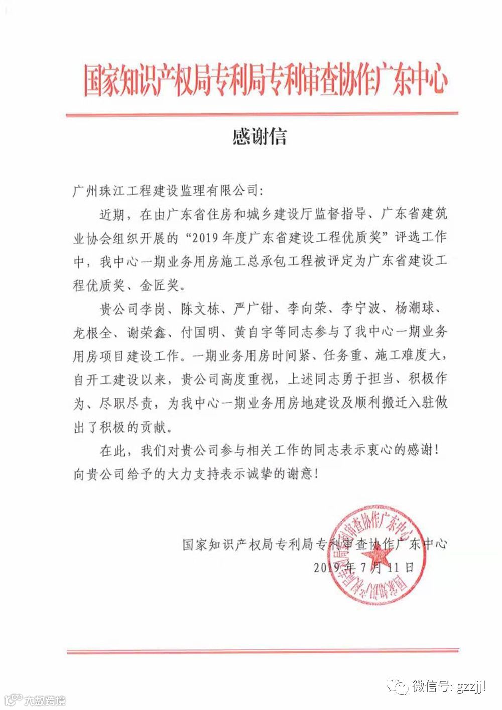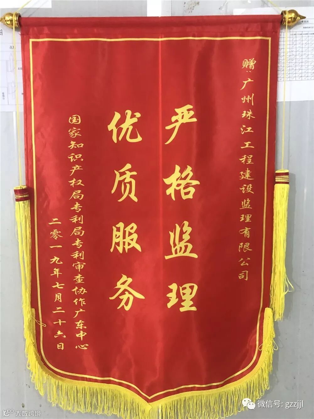 近日,国家知识产权局专利局专利审查协作广东中心对珠江监理国家知识产权局专利局专利审查协作广东中心项目中的各项工作表示高度认可,并向珠江监理赠送“严格监理、优质服务”锦旗。