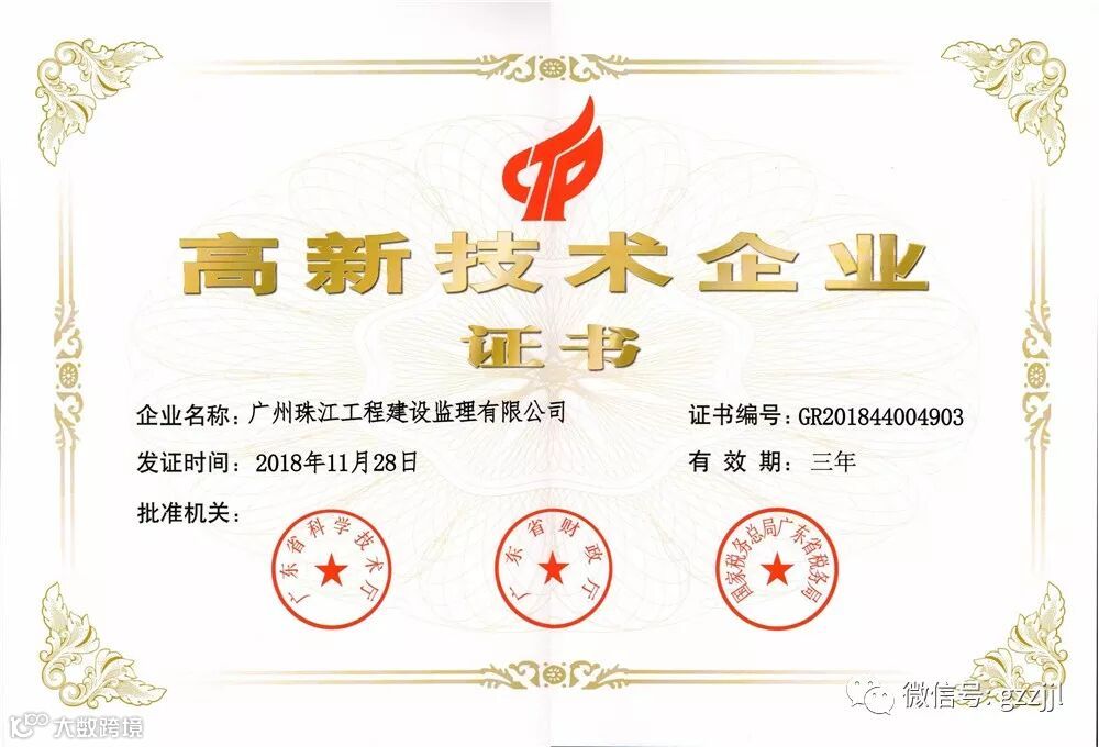 5月9日,珠江监理获广东省科学技术厅、广东省财政厅和国家税务总局广东省税务局联合颁发“高新技术企业”证书和牌匾,正式迈入高新技术企业行列。2018年广东省新评定“高新技术企业”共11431家,其中有6家监理企业。这是珠江监理继被评为2018年广州市总部企业后的又一重大喜讯!