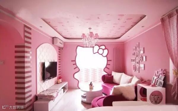 2 Feis女士的单层度假小木屋,被装修成了粉色,地毯也是粉色的,沙发也是粉色的,狗也是粉色的。