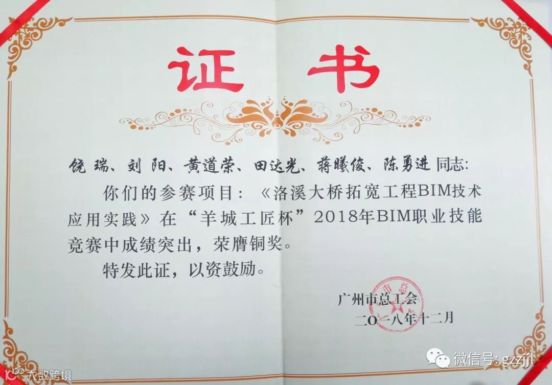 本次活动共95个项目参加,其中市政项目仅有2个(1路1桥),珠江监理洛溪大桥拓宽工程项目由各参建方主要人员组队参赛,成员有珠江监理市政公司黄道荣副经理(1人)、广州市中心区交通项目领导小组办公室饶瑞和刘阳(2人)、广东省长大公路工程有限公司第一分公司田达光、蒋曦俊、陈勇进(3人)。经过专家们的评审,洛溪大桥拓宽工程项目参赛团队脱颖而出,获得2018年“羊城工匠杯”BIM劳动和技能竞赛铜奖。