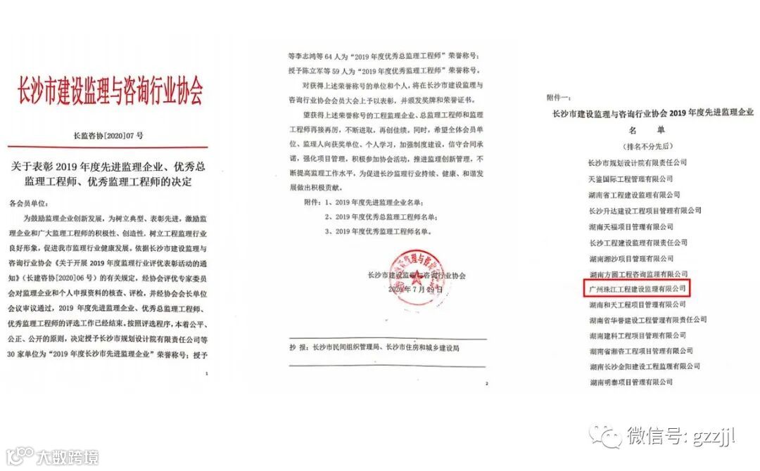 近日,长沙市建设监理与咨询行业协会发布表彰2019年度监理行业评优结果决定,珠江监理荣获2019年度“长沙市先进监理企业”荣誉称号,麦家顺、沈海同志被评为长沙市优秀总监理工程师,李徐杰同志被评为长沙市优秀监理工程师。