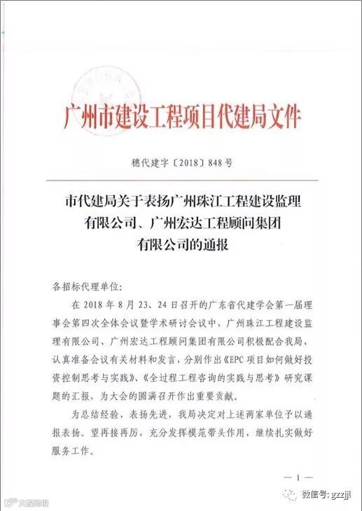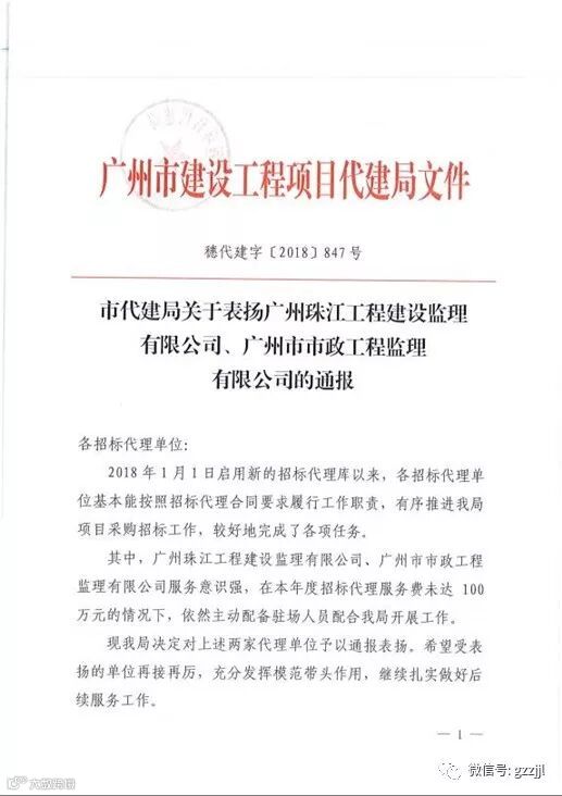 2018年岁末之际,珠江监理收到广州市建设工程项目代建局的两份通报表扬文件,旨在表扬公司在2018年为支持和服务业主各项工作所作出的突出贡献。