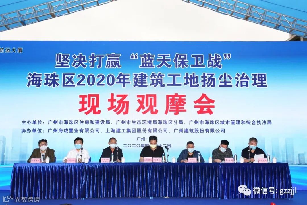 为确保完成海珠区2020年污染防治攻坚战考核目标, 4月22日下午,海珠区住建局在珠江监理广州国际航运大厦项目举办建筑工地扬尘防控现场观摩会。区住建局、区生态环境分局、区城管和执法局等部门相关领导,辖区内新开工项目及基坑出土项目建设、施工和监理单位等约130人参加了观摩会。