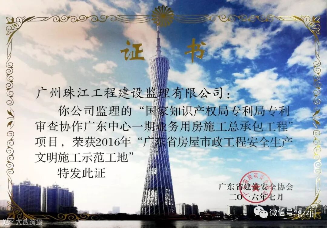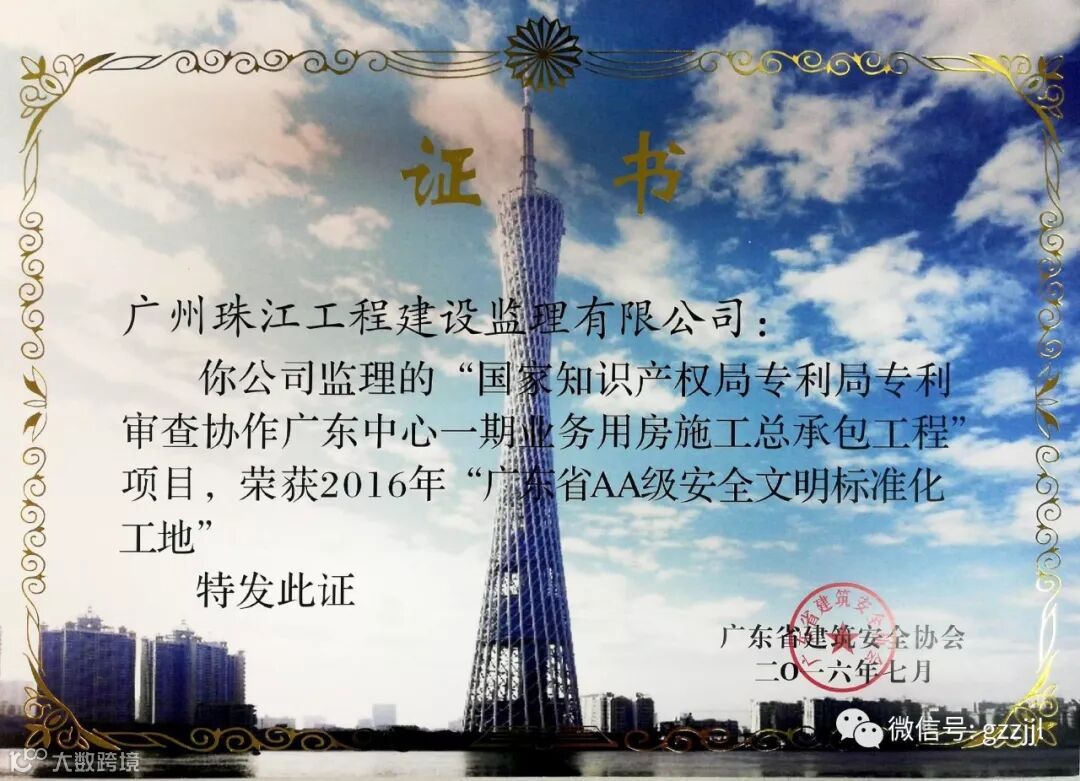 2017年12月,由珠江监理公司负责监理的国家知识产权局专利局专利审查协作广东中心一期业务用房项目荣获“2016年广东省房屋市政工程安全生产文明施工示范工地”和“2016年广东省AA级安全文明标准化工地”。
