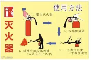 (4)学会使用灭火器,"一提二拔三对准四喷",注意区分干粉和干冰灭火器,当你的同事或者家人身上着火的时候,只能使用干粉灭火器对他们的身体进行喷射,否则干冰灭火器喷出的零下 70度的干冰,会让他们着火的身体的肌肉发生爆炸。