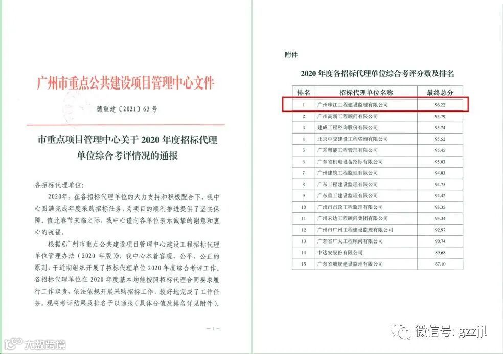 近日,市重点项目管理中心对招标代理库内的15家单位进行了2020年度代理单位综合考评,珠江监理以96.22分的总分数排名第一。
