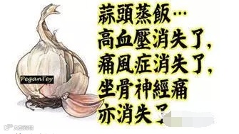 一位朋友每天吃蒜头蒸饭,晚餐用一把蒜头切碎煮饭,半年之后高血压消失了,痛风症消失了,坐骨神经痛亦消失了。