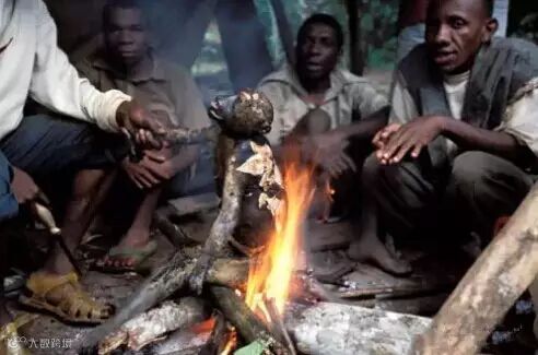 一群黑人在烤食一只猎捕的猴子