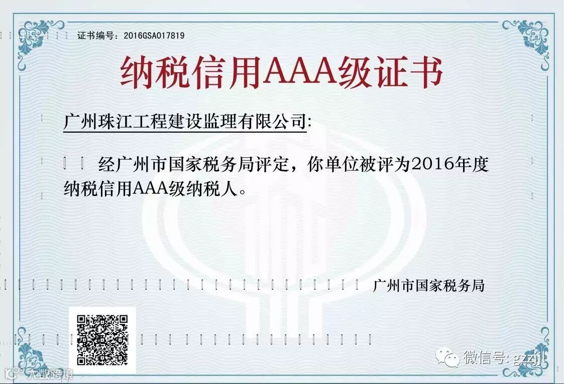 2017年5月,珠江监理公司经广州市国家税务局及广州市地方税务局联合评定,荣获“2016年度纳税信用AAA级纳税人”称号。