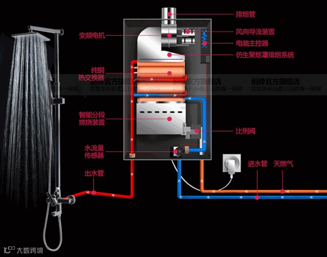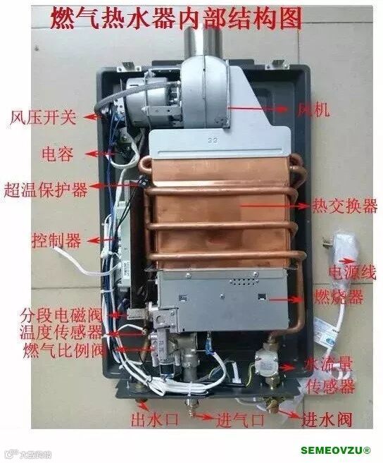 燃气热水器主要由外壳、风机、电容、风压开关、热交换器、燃烧器、燃气比例阀、控制器、电源线、水流量传感器、温度传感器、超温保护器、进水阀、显示器等配件组成。