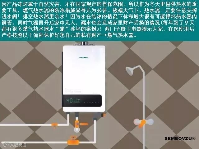 4.防水箱冻裂。北方的天气寒冷,在冬季几乎是零下多少度,所以需要要对燃气热水器安装防冻阀门或者防倒风装置。尤其是当户外气温低于零摄氏度时,须按照机身防冻警示贴或使用说明书要求进行防冻操作事项。