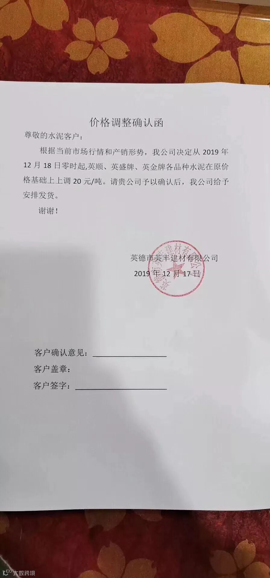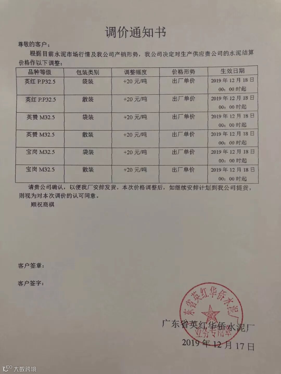 广东省英红华侨水泥厂水泥调价通知2019年12月18日零时起英红PP32.5R(包装、散装)、英赞M32.5(包装、散装)、宝岗M32.5(包装、散装)水泥在原价格基础上上调20元/吨。