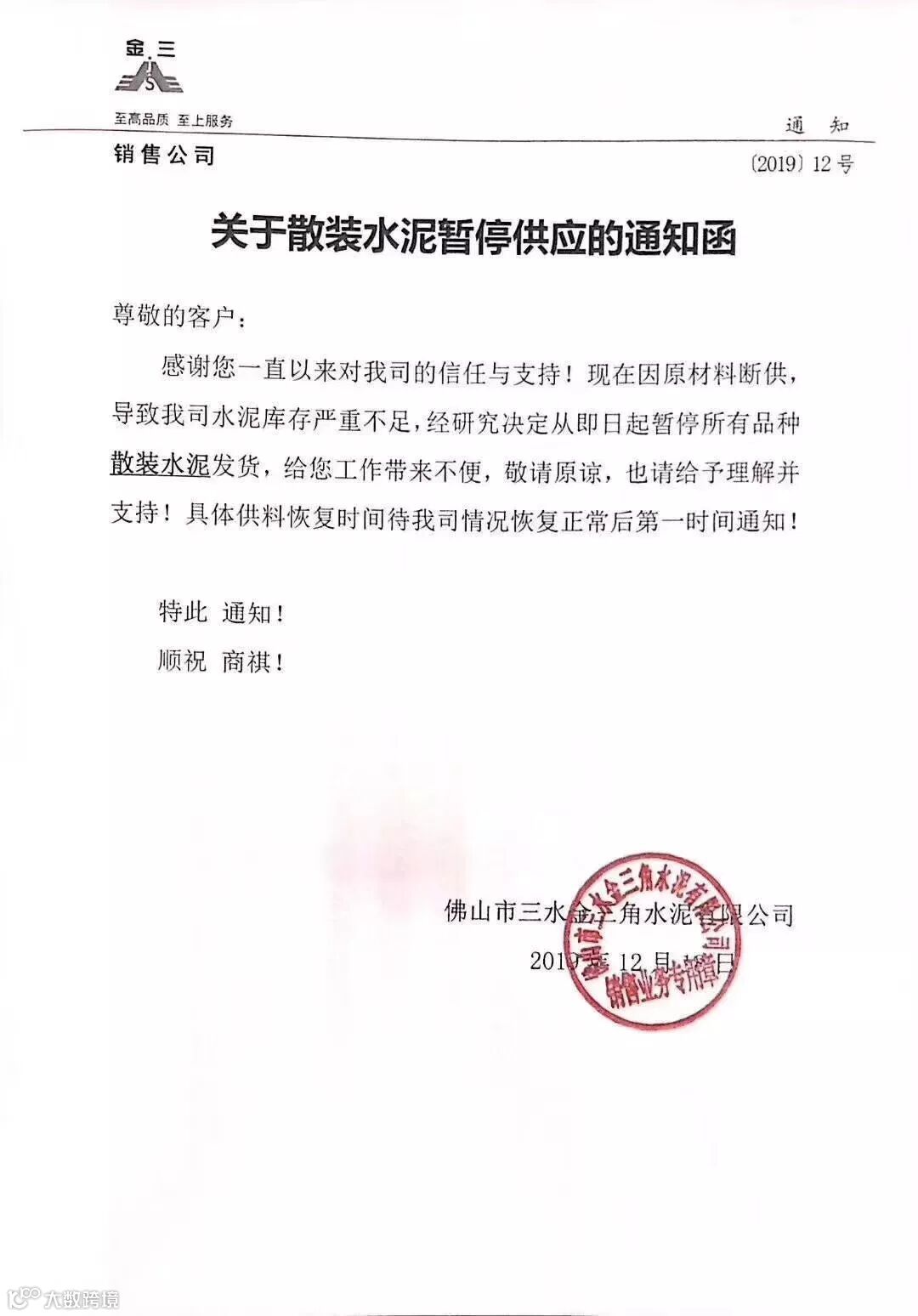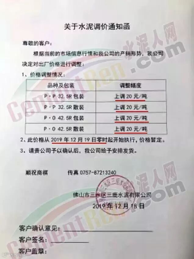 佛山市三水区三鹿水泥调价通知称自2019年12月19日零时起各标号水泥出厂价上调20元/吨。