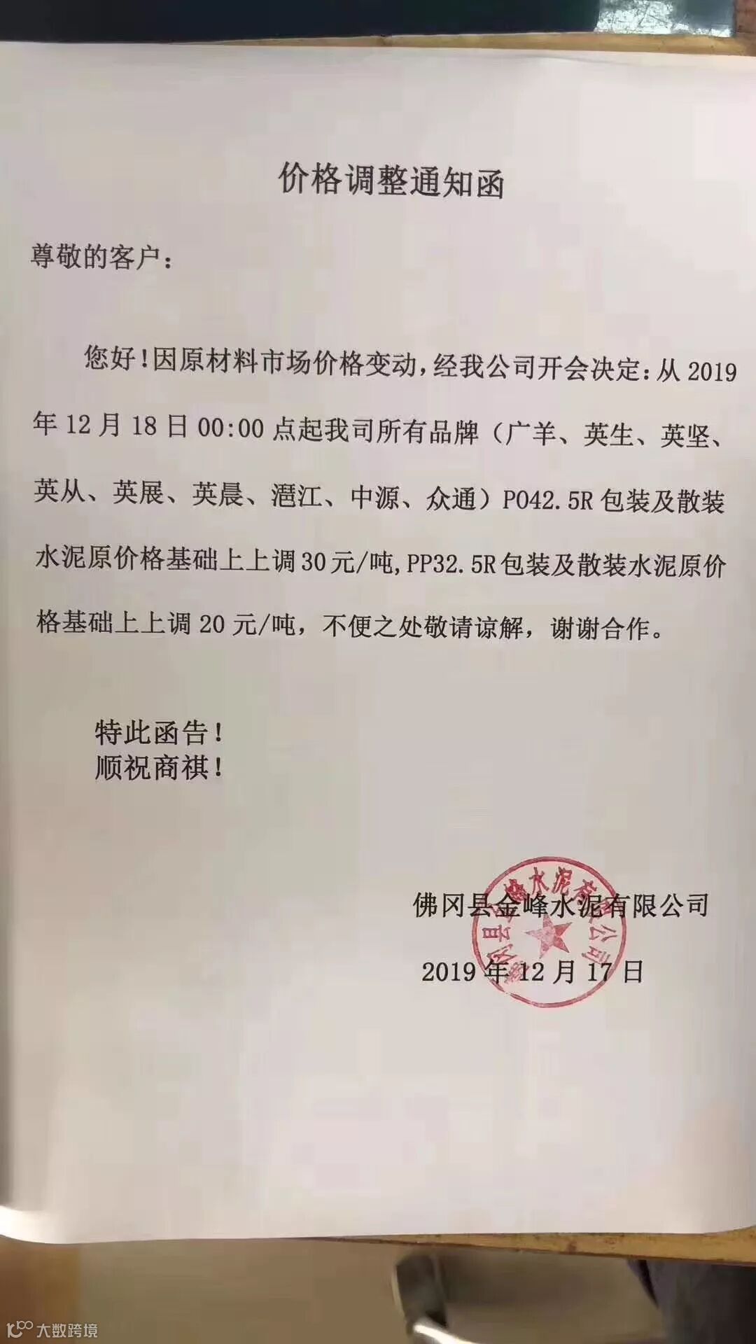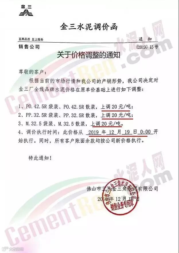 佛冈县金峰水泥有限公司水泥调价通知称自2019年12月18日零时起所有品牌PO42.5R包装及散装水泥原价格基础上上调30元/吨,PP32.5R包装及散装水泥原价格基础上上调20元/吨。
