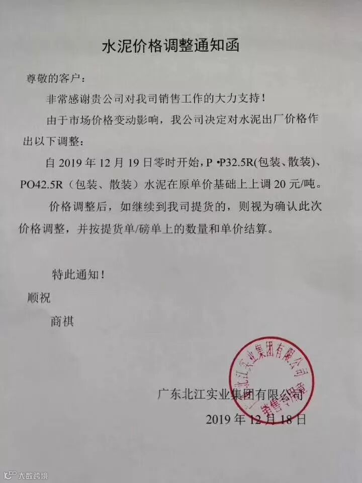 广东江北实业集团有限公司水泥调价通知称自2019年12月19日零时起PP32.5R(包装、散装)、PO42.5R(包装、散装)水泥在原价格基础上上调20元/吨。
