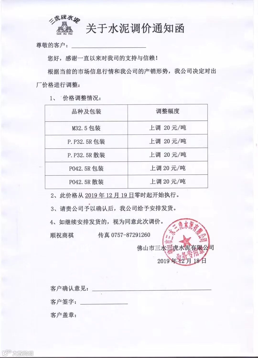 佛山市三水三虎水泥有限公司水泥调价通知称自2019年12月19日零时起M32.5(包装)、PP32.5R(包装、散装)、PO42.5R(包装、散装)水泥在原价格基础上上调20元/吨。