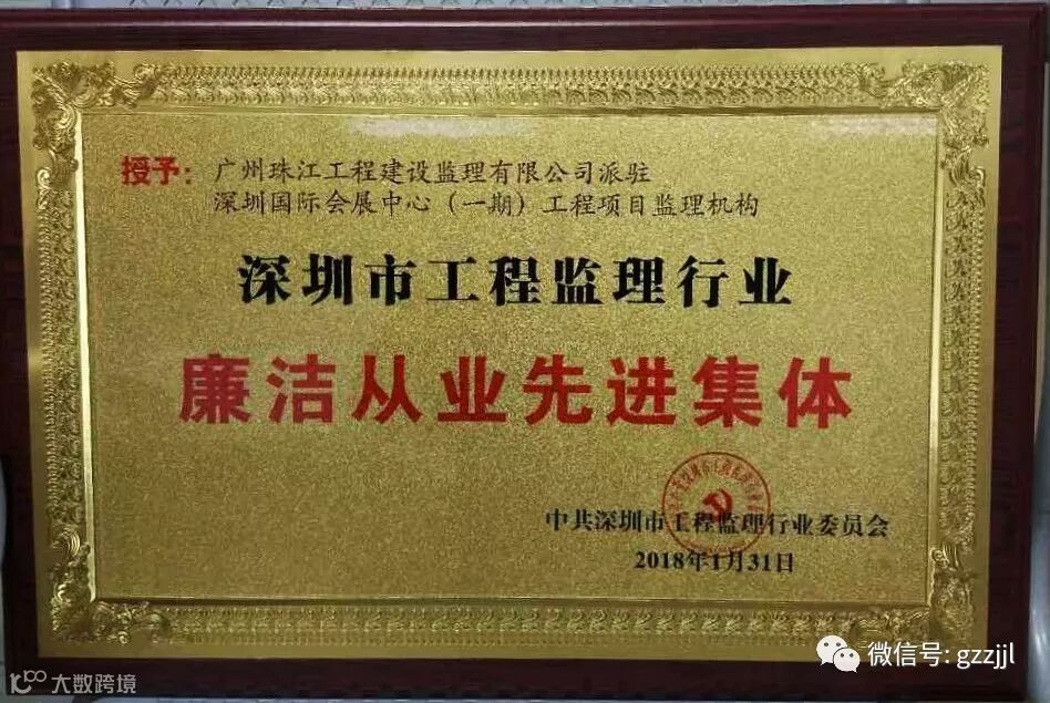 2017年1月31日,中共深圳市工程监理行业委员会授予广州珠江工程建设监理有限公司深圳国际会展中心(一期)工程项目监理机构“深圳市工程监理行业廉洁从业先进集体”称号。