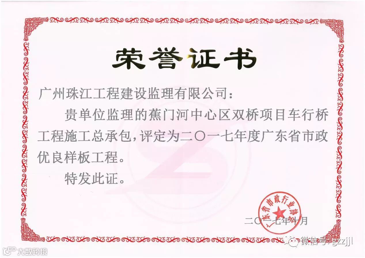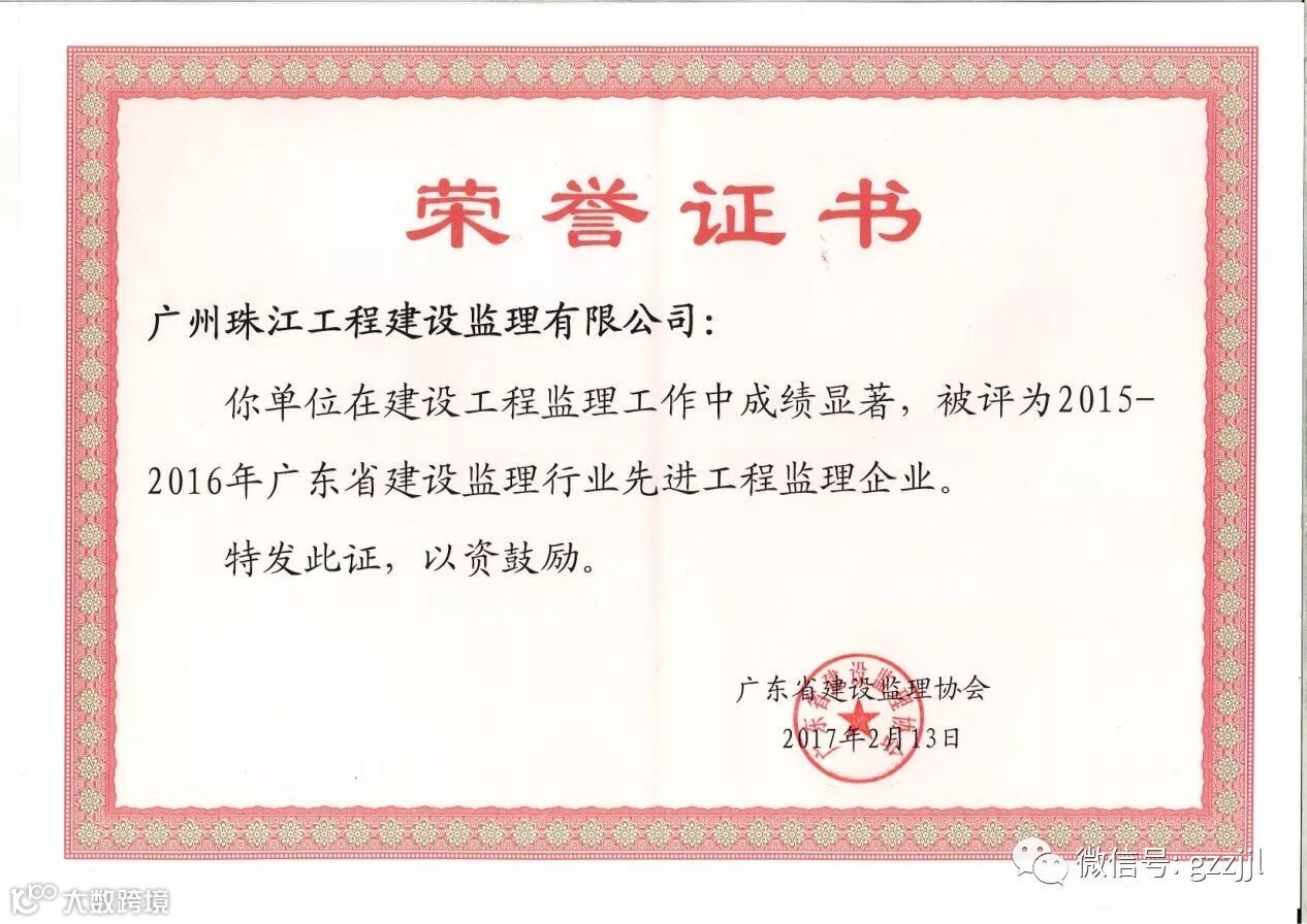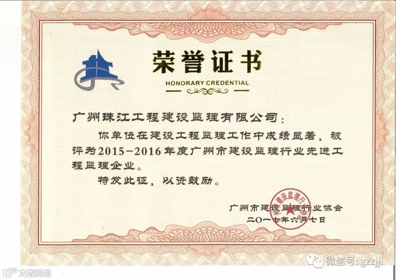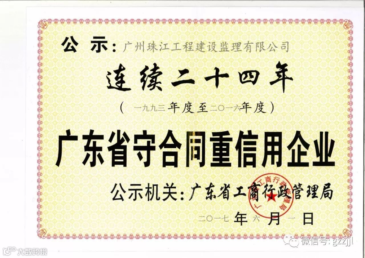 2017年,珠江监理公司单位先后获得全国工程监理收入百强企业、商务部AAA信用企业、广东省先进监理企业、广州市先进监理企业、广东省连续24年守合同重信用企业、广东省连续八年诚信示范企业等荣誉。
