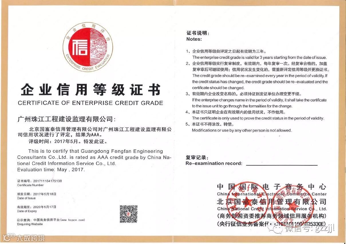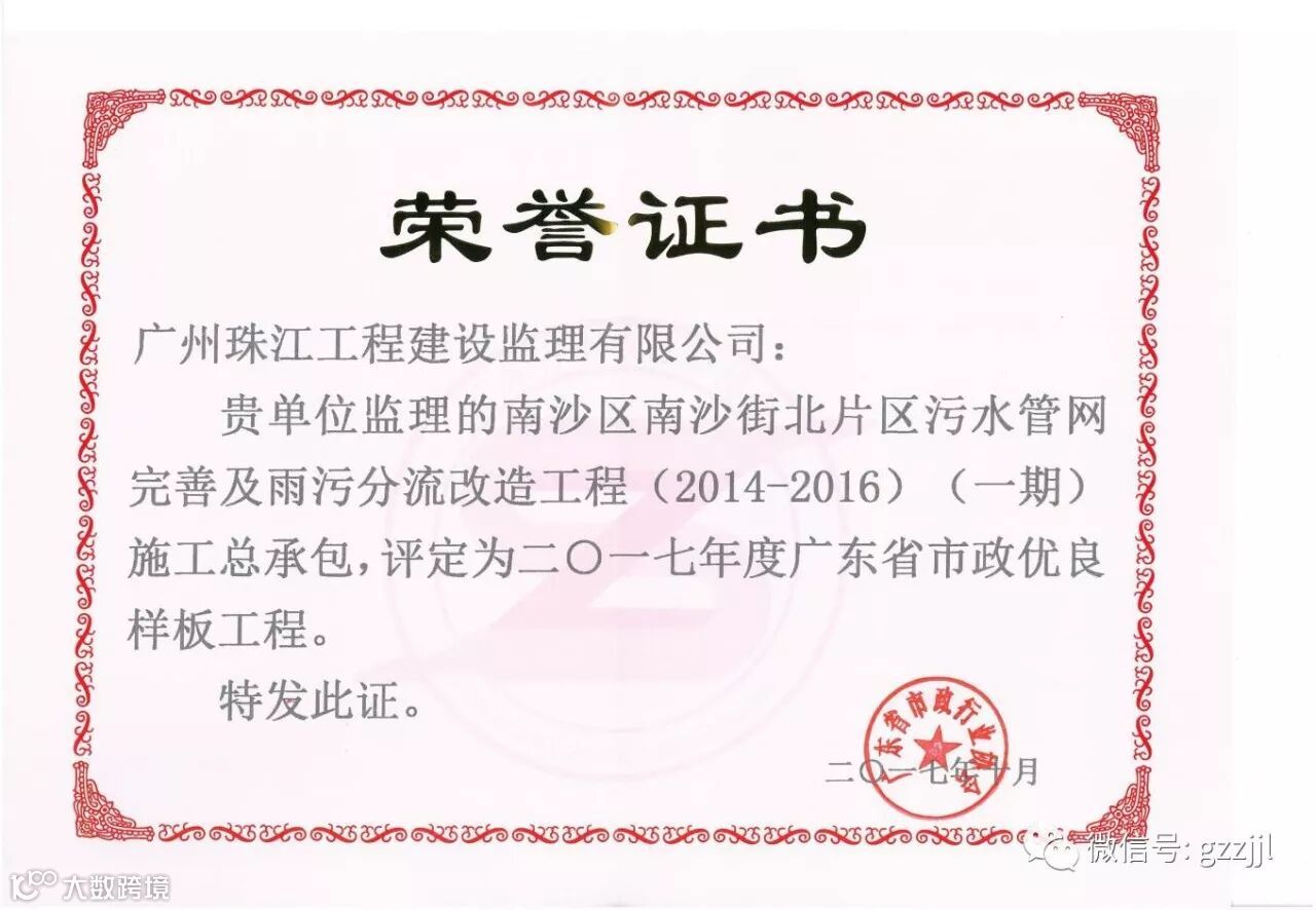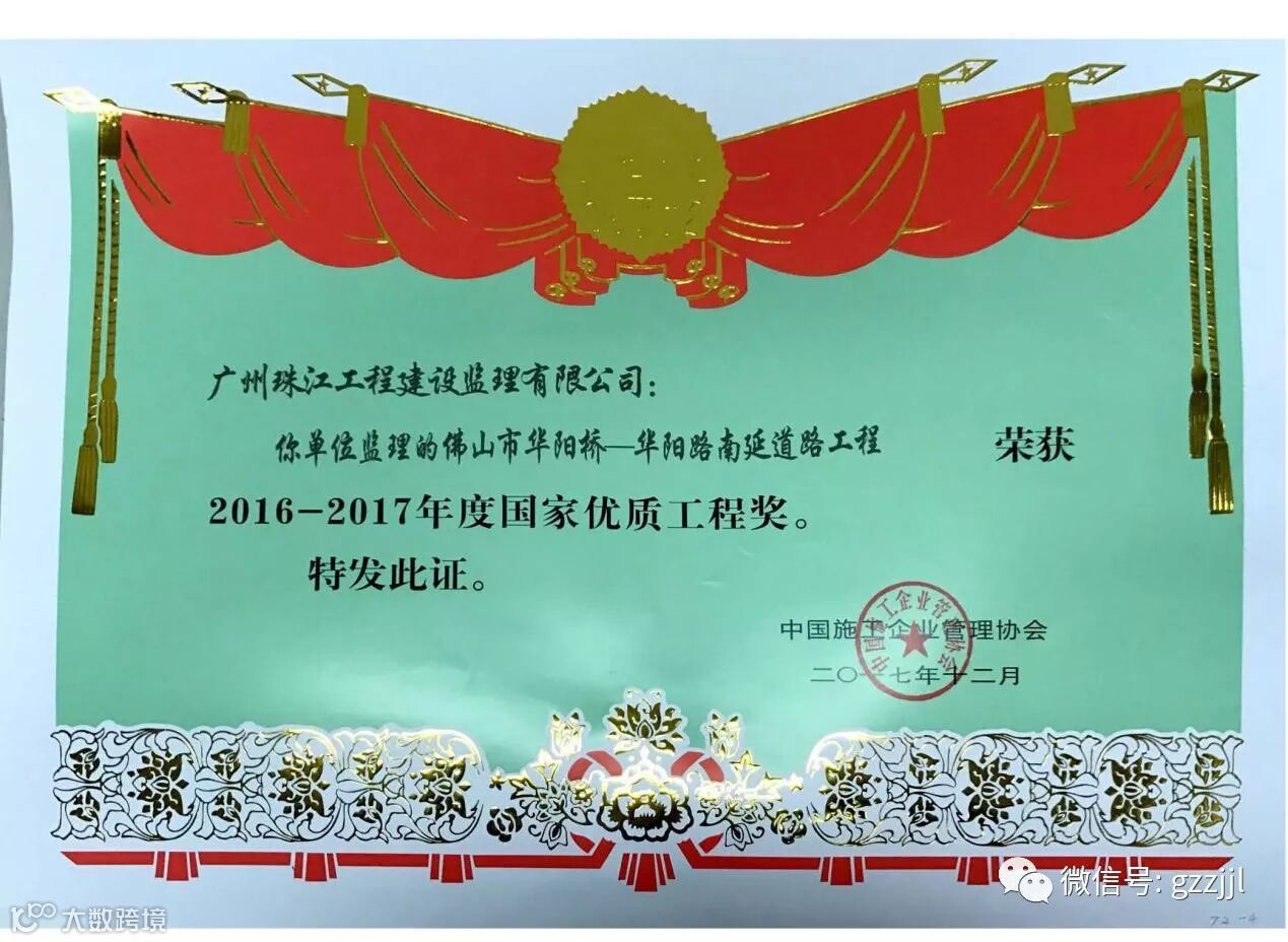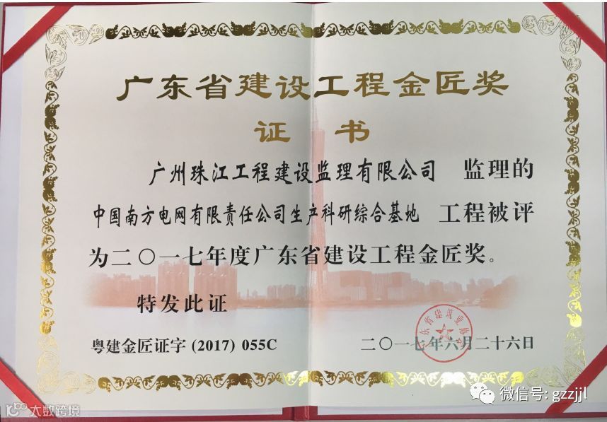 2017年,珠江监理公司单位先后获得全国工程监理收入百强企业、商务部AAA信用企业、广东省先进监理企业、广州市先进监理企业、广东省连续24年守合同重信用企业、广东省连续八年诚信示范企业等荣誉。