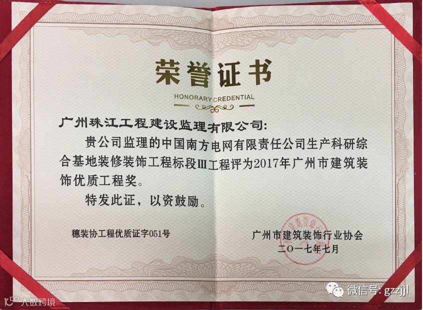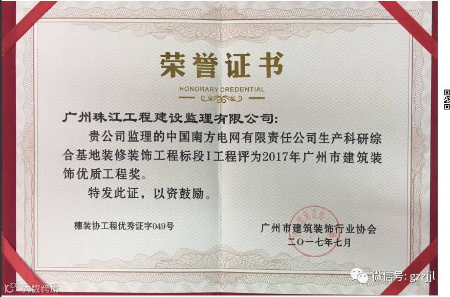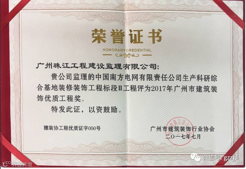 由珠江监理公司监理的中国南方电网有限责任公司生产科研综合基地装修装饰工程标段Ⅰ、Ⅱ、Ⅲ工程均荣获2017年广州市建筑装饰优质工程奖。