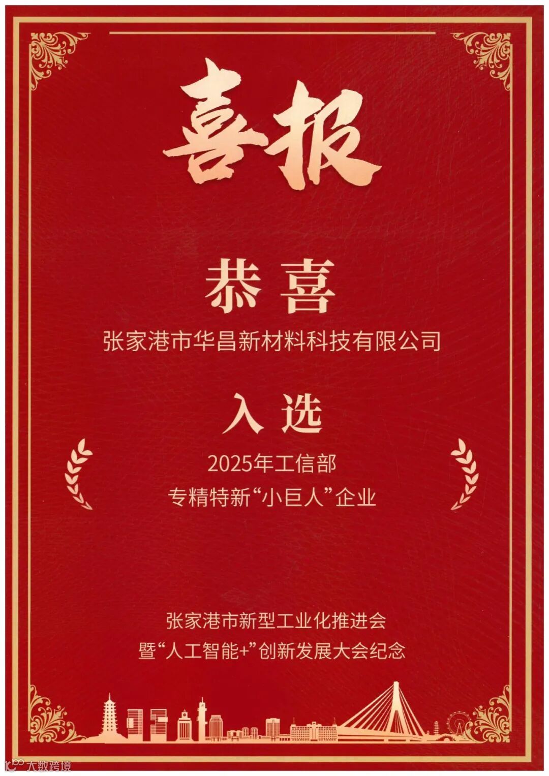 1月5日,张家港市召开2026年新型工业化推进会暨“人工智能+”创新发展大会。会议表彰了一批优秀企业,华昌化工凭借卓越表现,成功入围“十四五”期间张家港制造业企业产值、投资双15强企业。华昌新材料凭借入选2025年工信部特精专新“小巨人”企业荣获市级表彰。