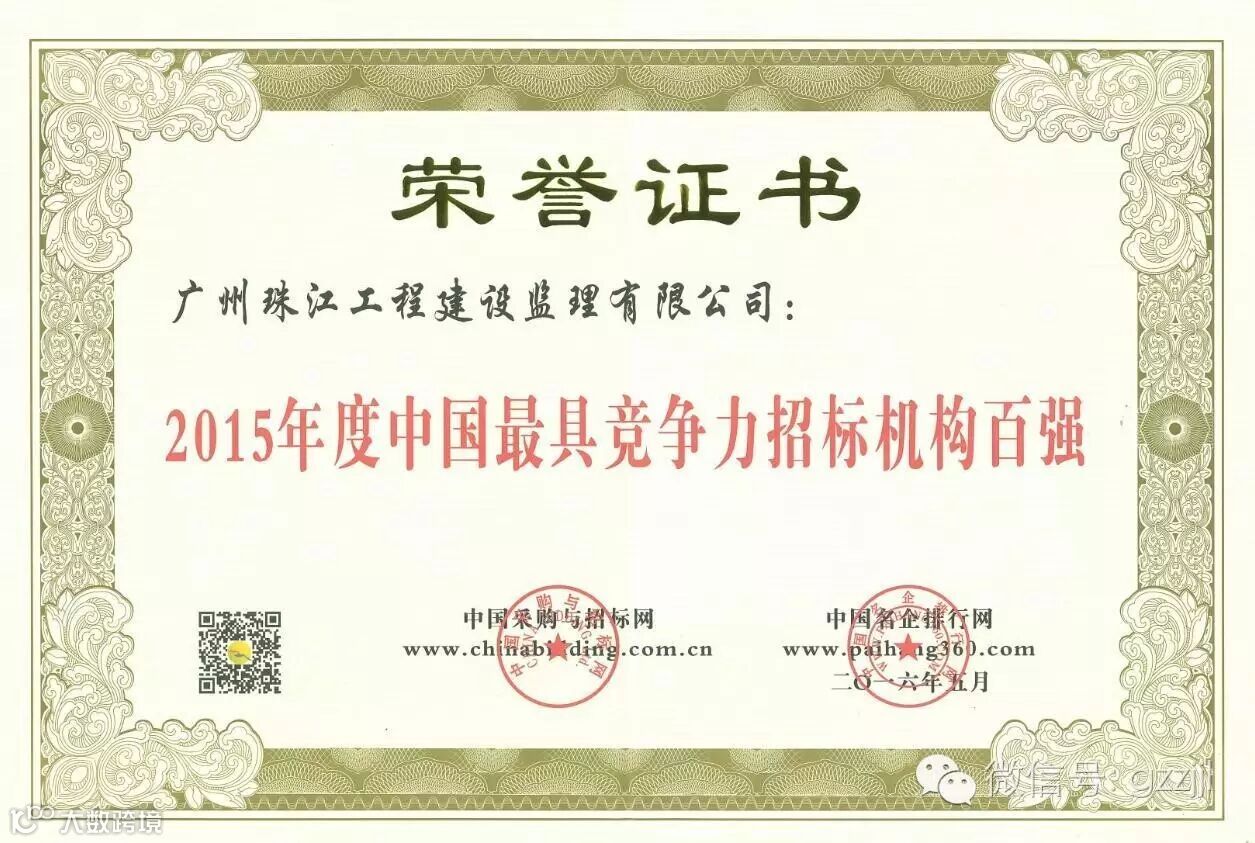 近日,珠江监理公司再次以企业综合实力等优势,荣获国家招投标法定媒体(中国采购与招标网)主办的第十届全国招投标领域年度聚焦评选2015年度“中国最具竞争力招标机构百强”荣誉。
