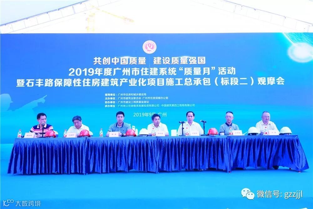 9月19日上午,广州市建筑联合会和市住保办联合主办的“2019年度广州市住建系统‘质量月’观摩会”在珠江监理石丰路保障性住房建筑产业化项目(标段二)举办,市住建局质安处副处长邓锐强、市住保办副主任陈桓军、市建设质监站副站长熊涛、珠江实业集团成本工程部总经理吕铭晓、珠江监理副总经理黄庆辉等领导和来自全市建筑行业相关职能部门、建设业主、施工、监理、检测、混凝土企业代表共近500人参加观摩会。会议由市建筑联合会副秘书长常桂枝主持。