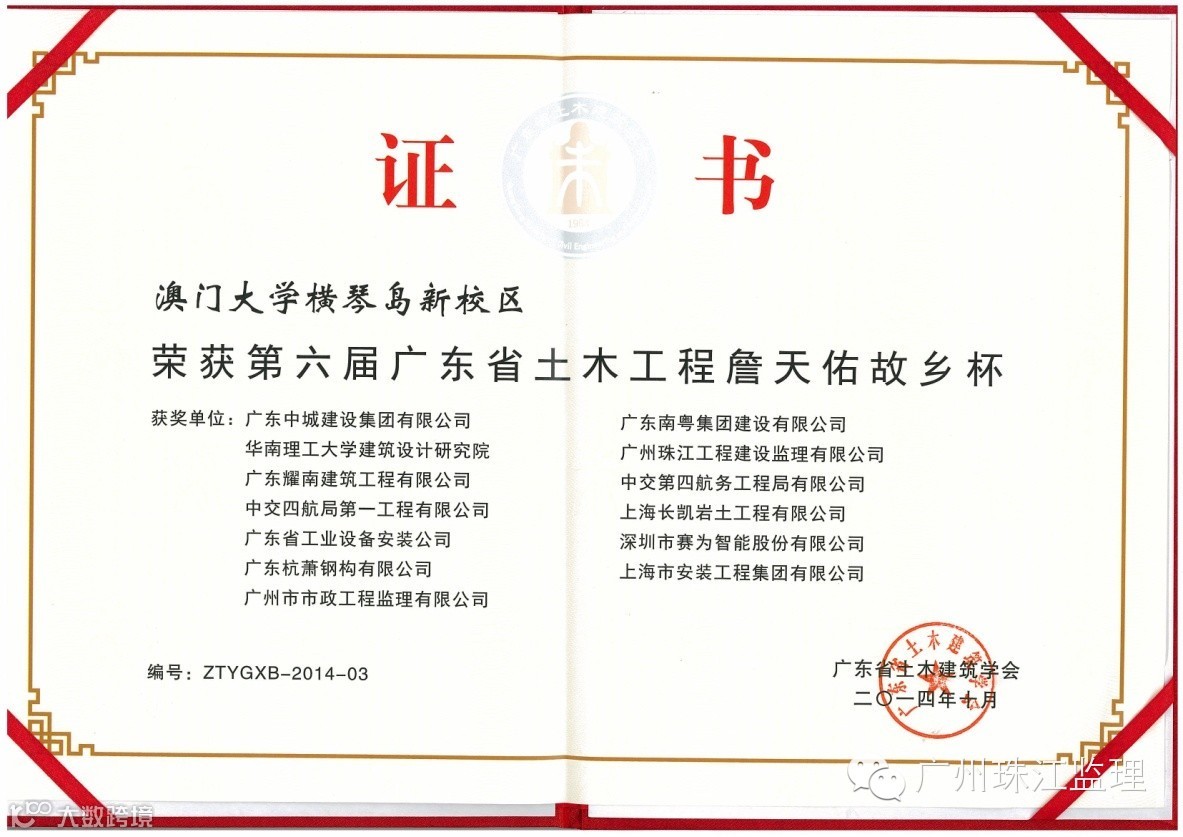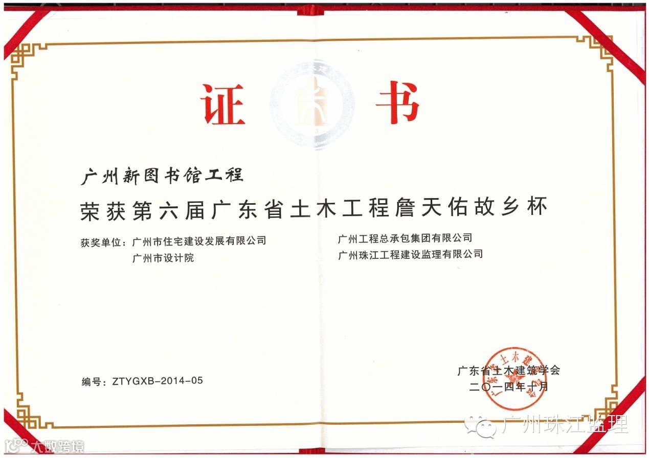 由珠江监理公司监理的广州新图书馆工程和澳门大学横琴岛新校区工程荣获第六届广东省土木工程詹天佑故乡杯。该奖项是广东省土木建筑工程科技创新最高荣誉奖。