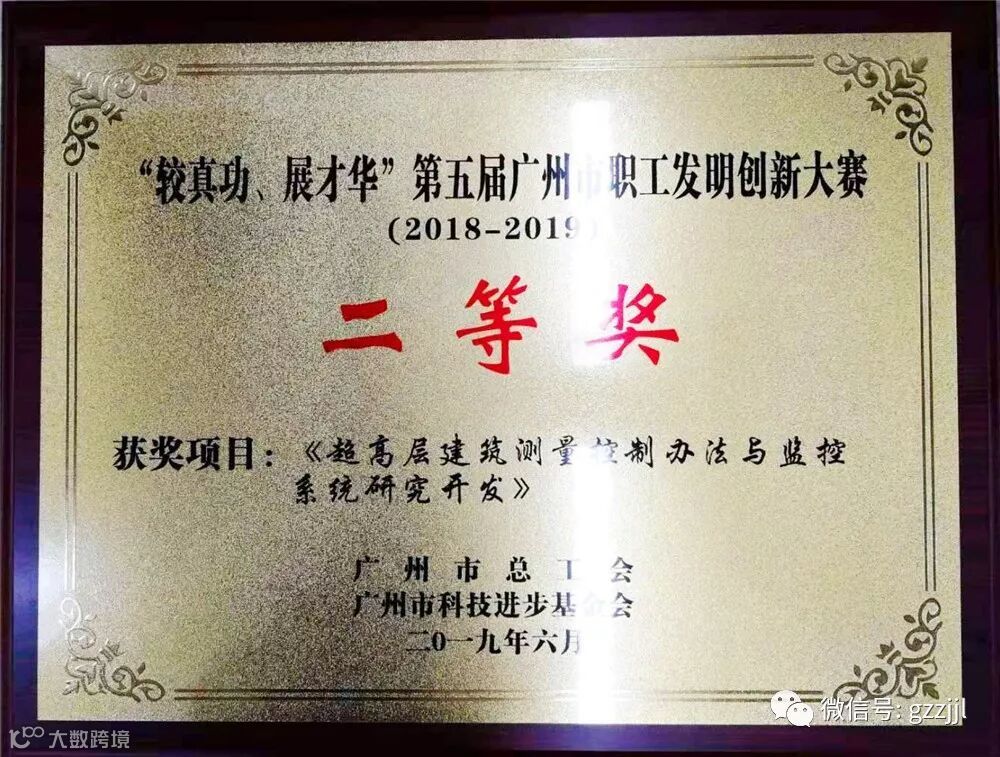 6月22日,第五届广州市职工发明创新大赛在广州琶洲会展中心举行总结表彰大会,珠江监理“超高层建筑测量控制办法与监控系统研究开发”技术荣获二等奖,并获颁证书和牌匾,这是珠江监理继被评为广东省高新技术企业后的又一喜讯。
