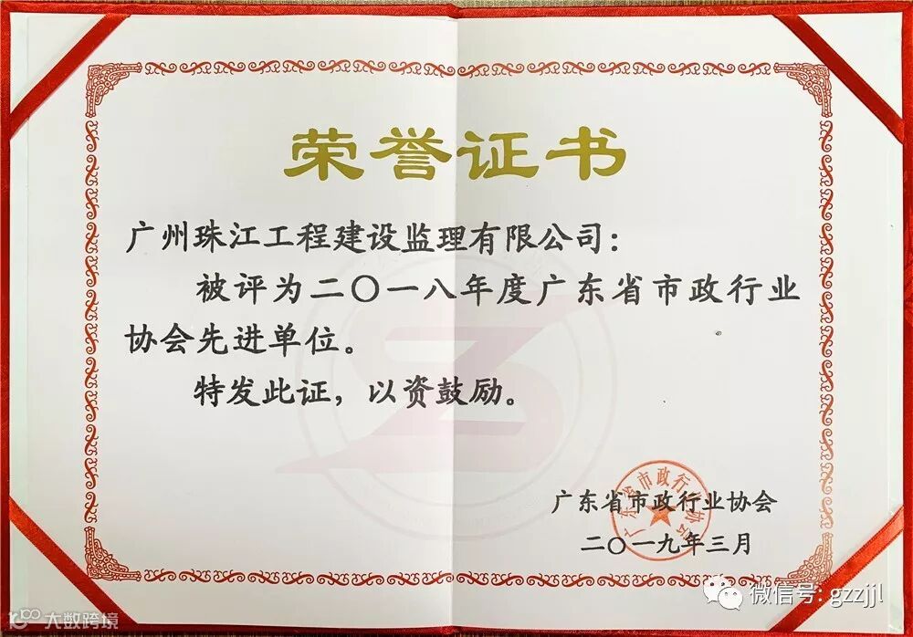 2019年3月21日,广东省市政行业协会第八届二次会员代表大会暨2018年表彰大会在中山市举行。珠江监理荣获2018年度广东省市政行业协会先进单位称号。
