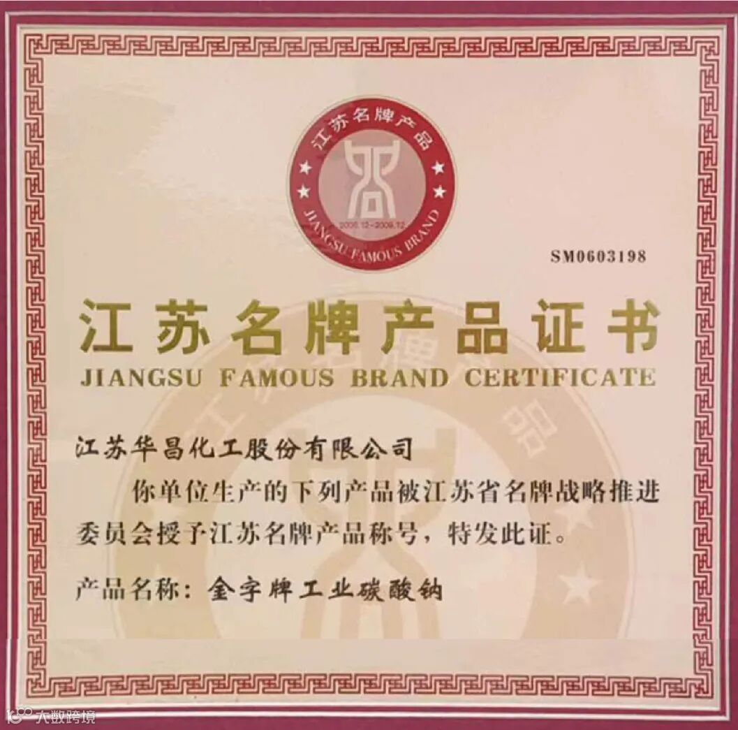 2007年3月,经江苏省名牌战略推进委员会审核评定,公司工业碳酸钠继续被评为江苏省名牌,进一步提升了公司在行业内的地位和影响力。