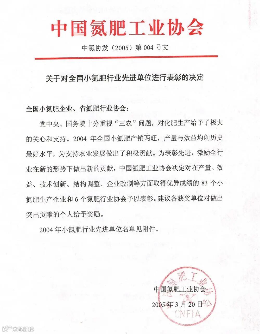 同年3月20日,中国氮肥工业协会授予公司“2004年氮肥行业先进企业”称号,肯定了公司为支持农业发展作出的积极贡献。