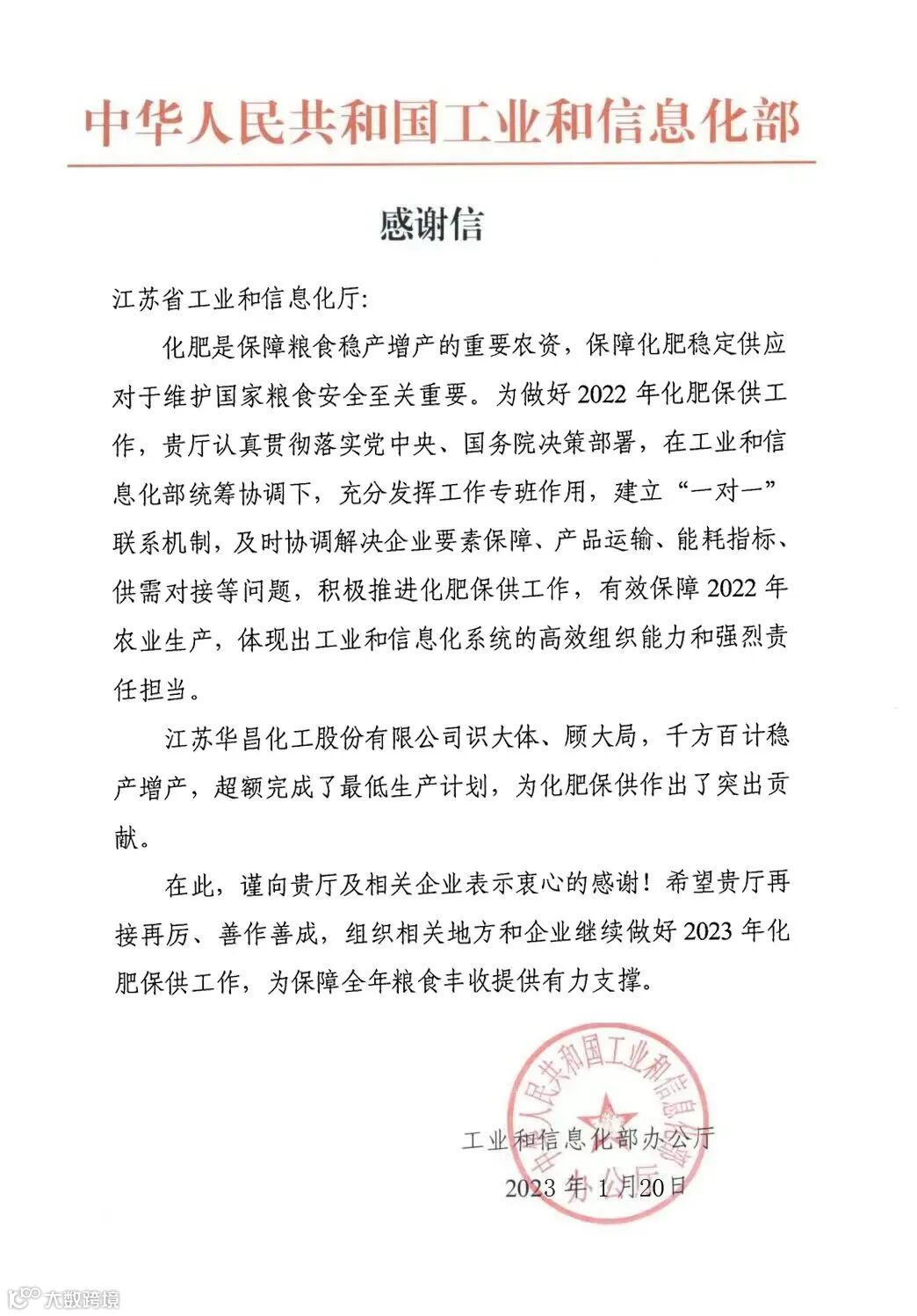 近日,华昌化工收到国家工业和信息化部办公厅的感谢信。感谢信指出,2022年度江苏华昌化工股份有限公司识大体、顾大局,千方百计稳产增产,超额完成了最低生产计划,为化肥保供做出了突出贡献。
