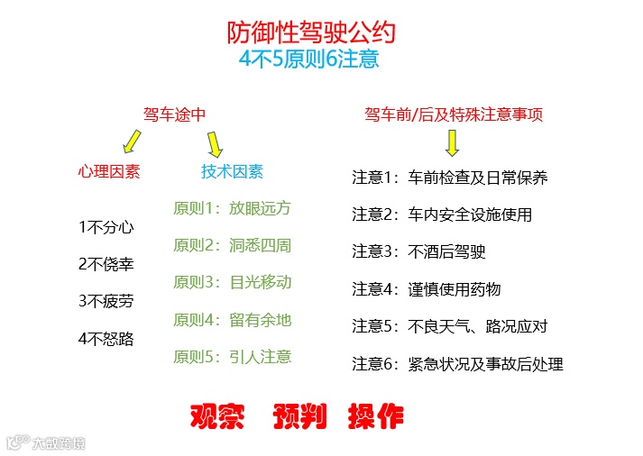 防御性驾驶是通过对周围道路环境和其他道路使用者的行为的预判来驾驶车辆的一种方法、理念。防御性驾驶技术并不是教人开车的方法,而是一套对驾驶实践进行系统总结的安全驾驶技巧,是面对各种情况如何预测、远离和应对危险的驾驶技术和用路哲学,其核心是“预防”,它可引领驾驶员在驾驶过程中对不同的驾驶环境中出现的危险作出准确的预先判断并提前采取适当的方法。