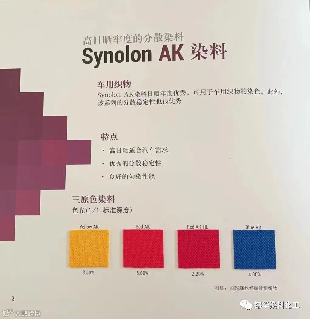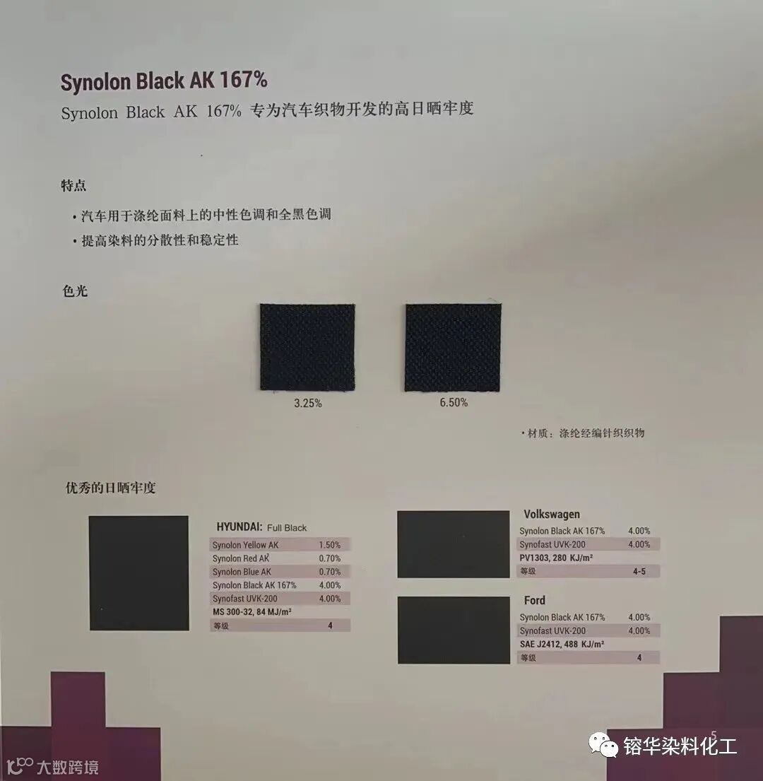 Synolon Dark Grey AK 是专为汽车织物和最高日晒织物染色而开发的,能满足特高日晒牢度,该系列的分散稳定性也很优秀。