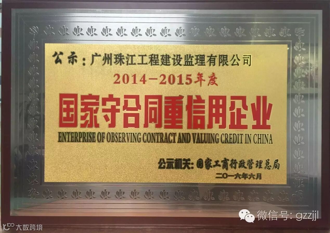 6月27日,从国家工商行政管理总局下发《关于公示2014-2015年度“守合同重信用”企业的公告》获悉,珠江监理公司被首次授予“2014-2015年度全国守合同重信用企业”荣誉称号。