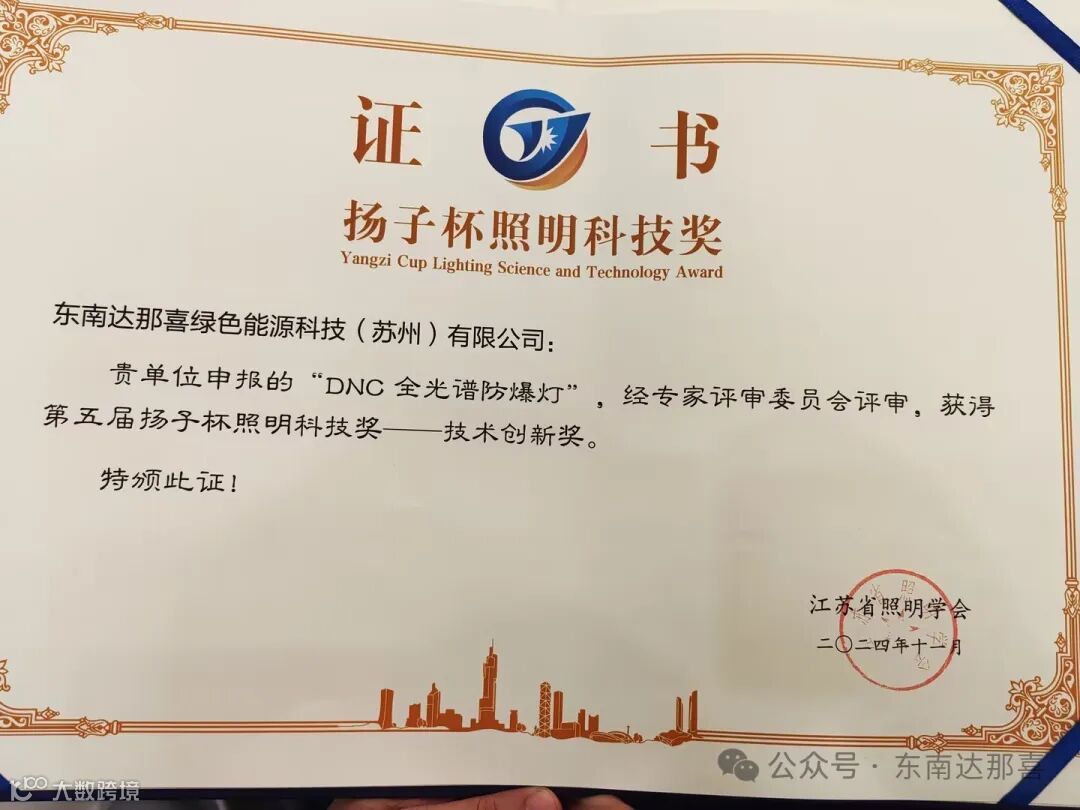 凭借出色的技术创新和卓越的产品性能,DNC全光谱防爆灯在论坛上荣获了技术创新奖。这一奖项不仅是对东南达那喜在绿色照明领域创新成果的认可,更是对公司持续创新、不断进取精神的肯定。