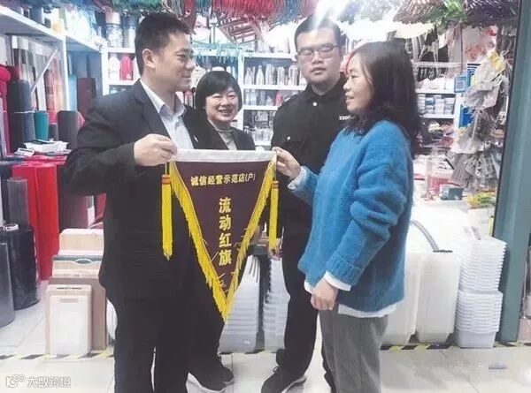 另外通过对商户垃圾分类工作的考核鉴定经营户文明诚信等级,颁布“流动红旗”和“流动黄旗”。优则奖,劣则罚。现在经营者们正铆足了劲,争抢流动红旗。