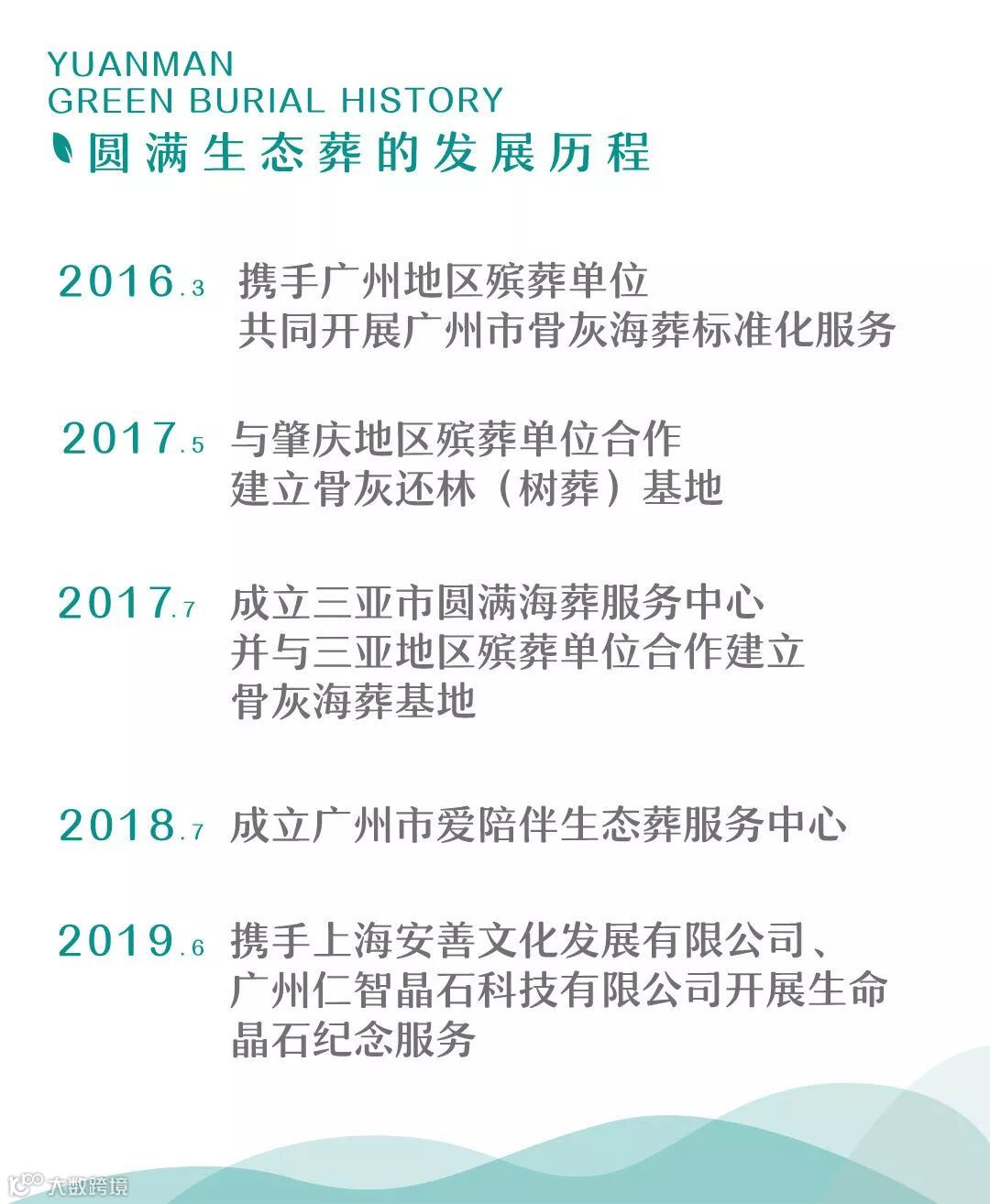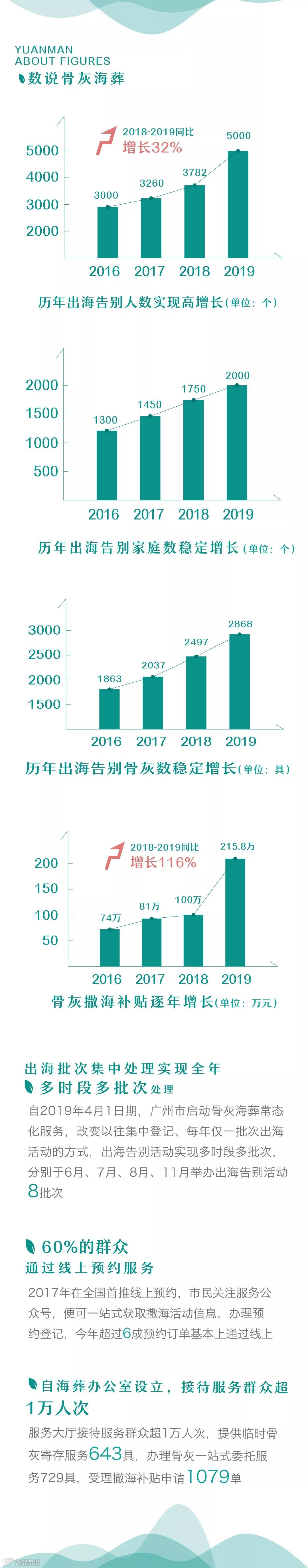 截止2019年,圆满生态葬品牌已成功创立骨灰海葬、骨灰还林(树葬)、生命晶石等生态葬项目,全年服务家庭数超过5000户,共20000多人次。