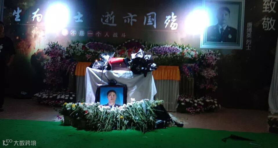 前来吊唁的人们站满了整个灵堂,唐博英烈士的照片是那么的安详。