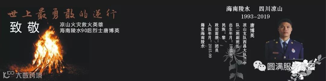 2019年3月31日,在四川省凉山州木里县雅砻江镇发生的一场森林火灾,27名森林消防指战员和3名地方扑火队员壮烈牺牲。其中,牺牲的消防员唐博英正是来自海南陵水黎族自治县。