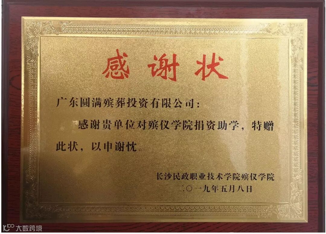 为感谢母校多年来的培育之恩,2015年,圆满服务专门设立年度长沙民政职业技术学院奖学金,用于奖励在校期间表现优秀的学子。随着中国殡葬职业教育集团的成立,圆满服务与院校之间的合作也迈向了新的里程。