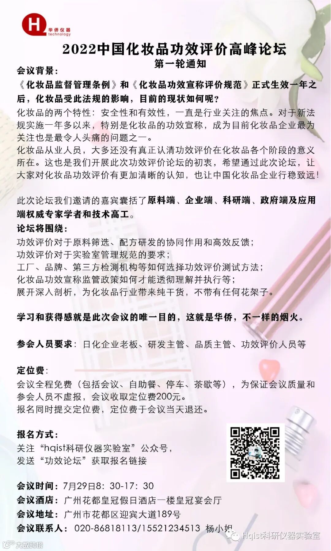 报名方式:扫描二维码关注“hqist科研仪器实验室”公众号,发送“功效论坛”获取报名链接,进行报名,不接受线下报名!