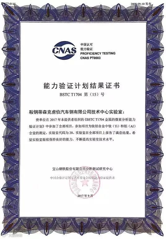 2017年3月-9月期间TAGAL技术中心研发实验室参加了由中国合格评定国家认可委员会CNAS组织的《BSTCT704金属的微束分析能力验证计划》,能力验证活动在宝钢测试研究中心进行,全国多个拥有扫描电镜及能谱的大学及科研单位参与了此次活动。TAGAL参与了钛铝合金中钛(TI)和铝(AL)含量的测定项目,执行GB/T17359-2012《微束分析能谱法定量分析》检测方法。采用无标样定量分析,XPP算法修正。