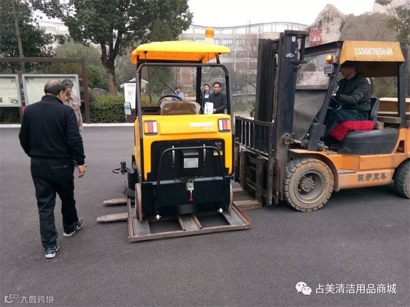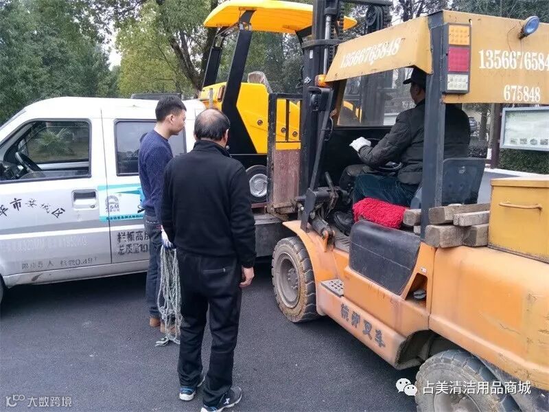 明诺E800W驾驶式扫地机顺利送达金华汤溪中学院,叉车师傅帮忙把机器抬下车。