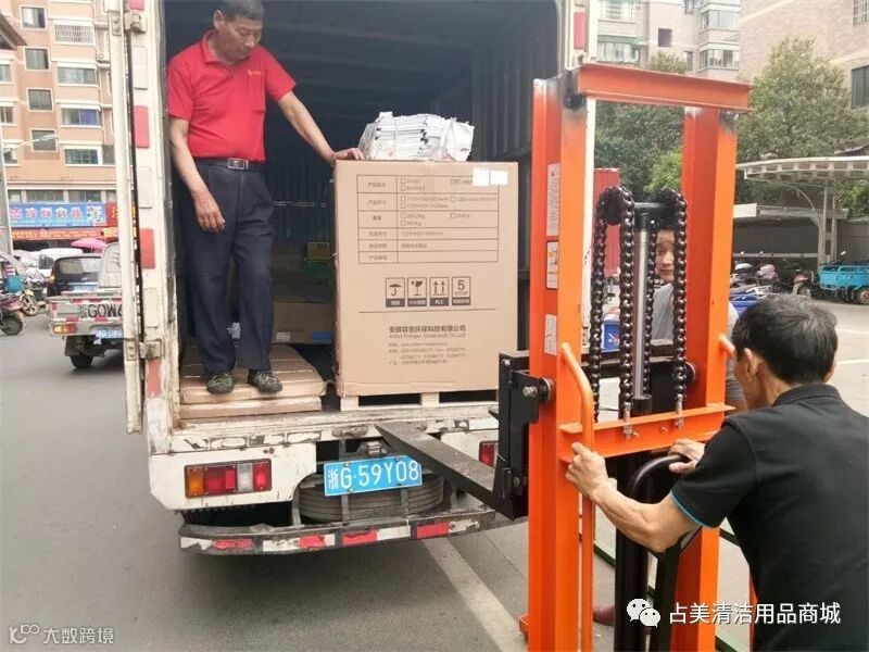 占美公司的同事把容恩R-XBEN驾驶式洗地车抬下车。